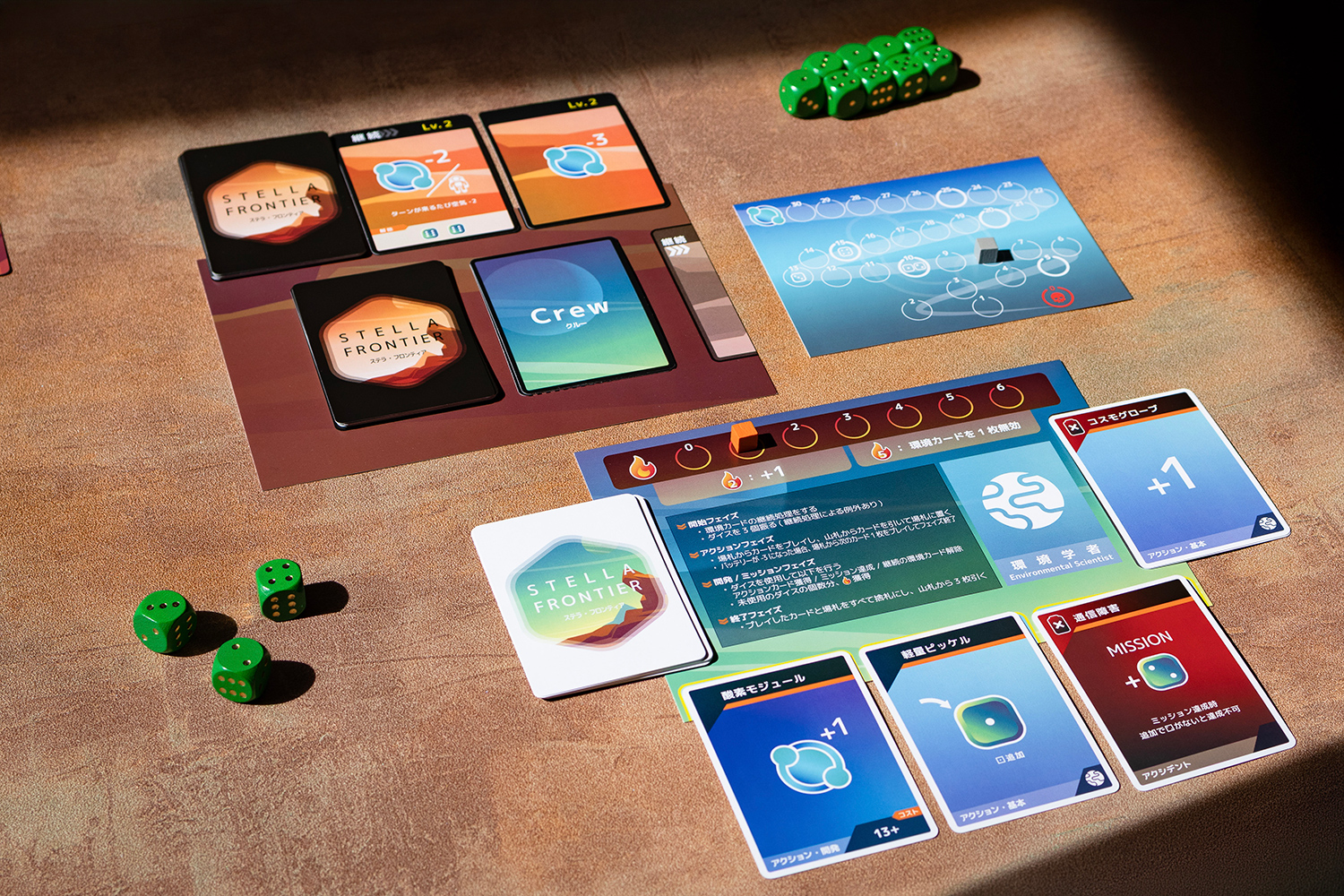 ミッション達成に必要なのは、ダイスとそれを操作するカードのデッキ、そして仲間との連携。