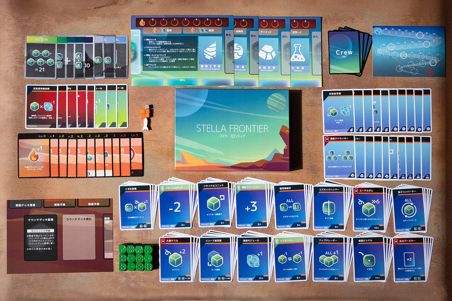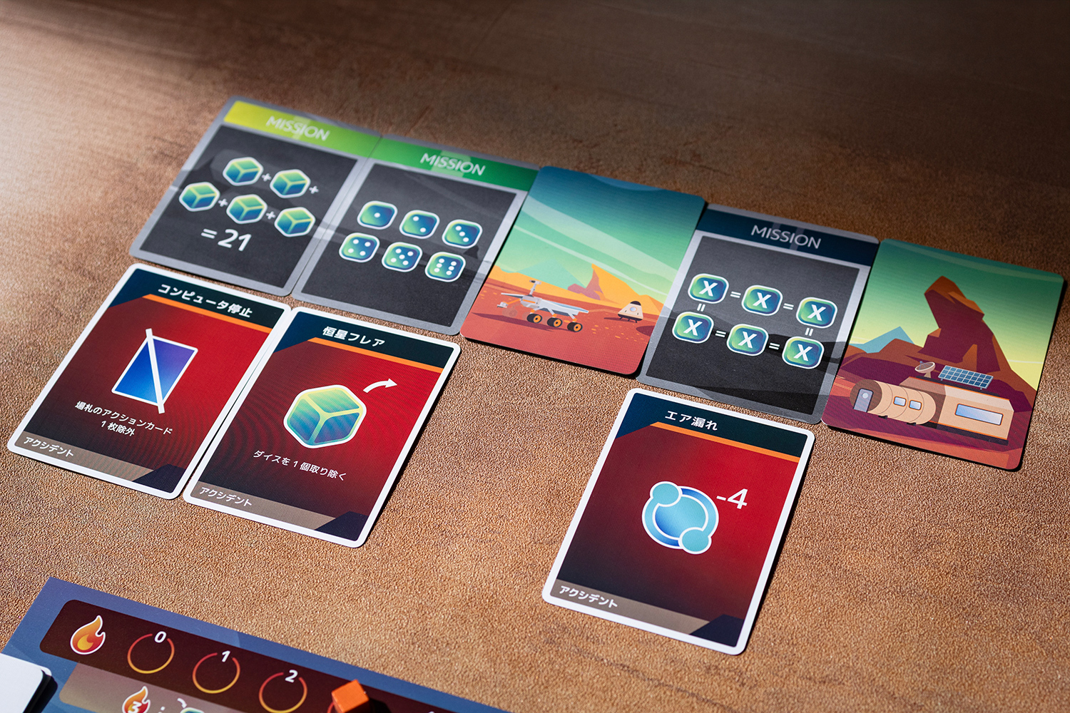 このゲームは、ダイスの目を操作してミッションを達成する協力型デッキ構築ゲームです。